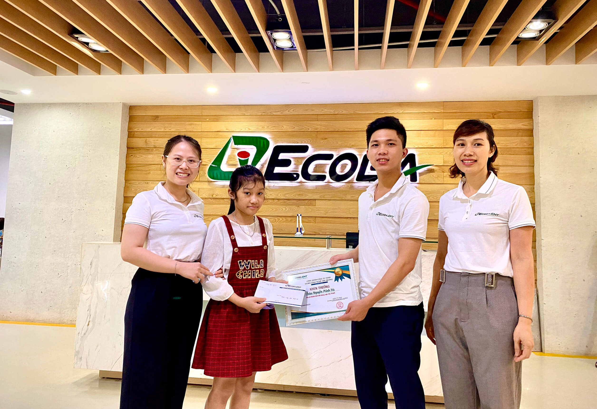 Đại diện Ban chấp hành Công đoàn Ecoba ENT đã trao tặng bằng khen và quà tặng cho cháu Nguyễn Minh Hà, cũng như động viên tạo động lực cho cháu tiếp tục phấn đấu, phát huy được trí tuệ và sự sáng tạo của mình trong những hoạt động thiết thực dành cho cộng đồng, môi trường và đất nước Việt Nam.