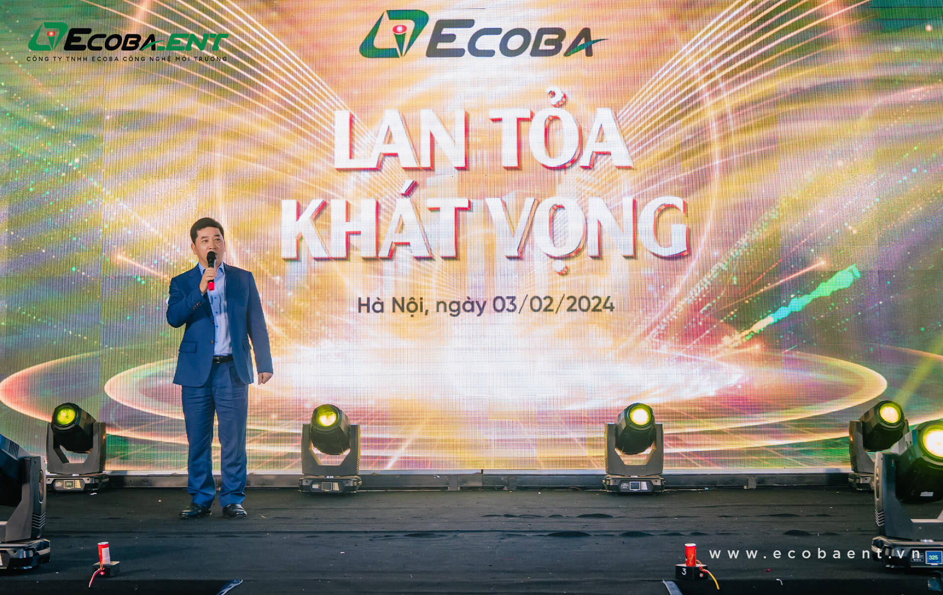 Ngay mở đầu, chương trình đã mang đến một không khí đầy tự hào và bùng nổ với màn múa tương tác led “Đế chế Ecoba” để nhìn lại một năm đã qua của Ecoba, kết tiết mục Tổng Giám đốc Võ Tiến Đạt tiến lên sân khấu với ngọn đuốc để thổi bùng lên ngọn lửa của năm 2024 đầy rực rỡ.